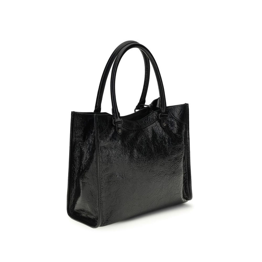The Le City Tote mini Handbag by Balenciaga is an elegant and functional accessory, crafted from Arena lambskin with brass hardware. The tote design features two top handles and a removable, adjustable strap, offering versatile carry by hand or on the shoulder. It includes a magnetic closure, a front zip pocket with a knotted leather puller, as well as one main compartment and an interior zip pocket. The cotton canvas lining completes the design with a practical and refined touch.