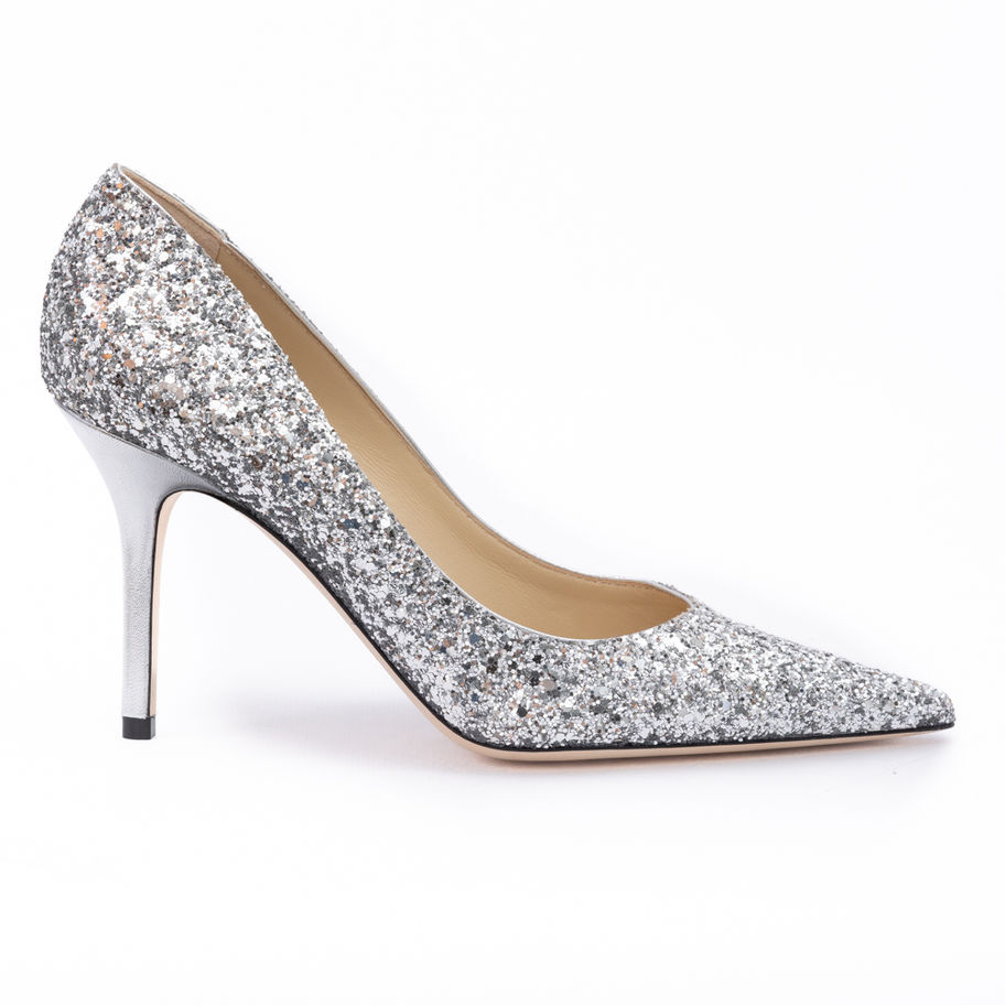 Jimmy Choo Silver Coarse Glitter Fabric Agnes Pumps