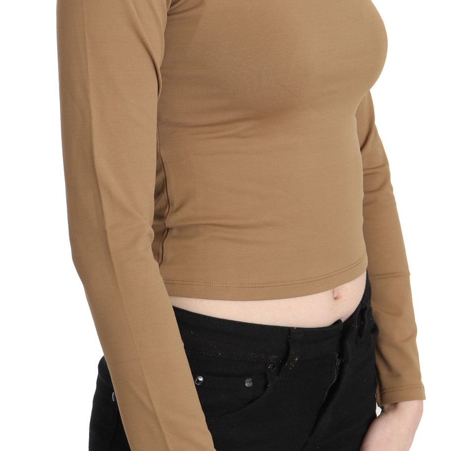 GF Ferre Brown Round Neck Long Sleeve Slim Crop Top Blouse