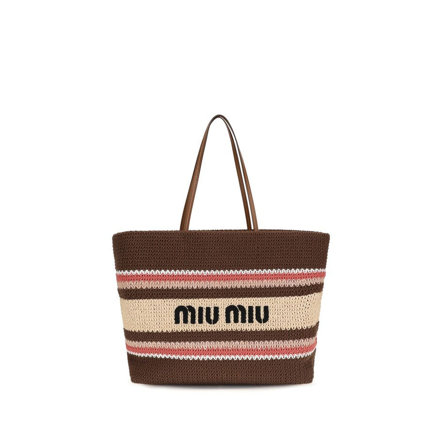 The raffia-effect yarn Tote Bag by Miu Miu combines charm and versatility, with a woven pattern of colors that forms the distinctive Miu Miu logo, highlighting its unique, summery character. Featuring leather handles and gold-tone hardware, it has a drill-weave interior with a zippered pocket and an embroidered logo on the front, making it perfect for completing sophisticated, effortless looks.