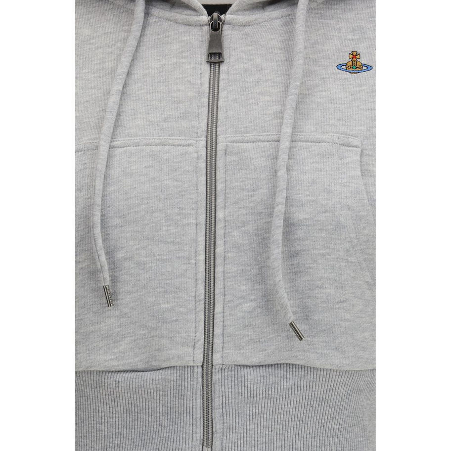 The Leo Hoodie by Vivienne Westwood combines comfort and style in a modern and distinctive design. Featuring a drawstring hood and a light blue and white striped interior, it has long sleeves, a double front zip, and two front pockets. Ribbed edges and a cropped fit complete the look, while the multicolored Orb logo embroidered on the chest adds an iconic and sophisticated touch.