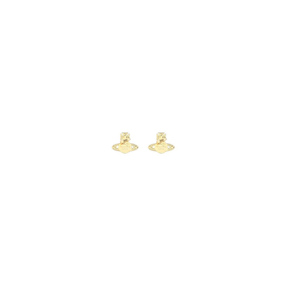 Carmela Earrings by Vivienne Westwood, classic butterfly back closure, design with iconic brand logo gold-plated with shiny beads.