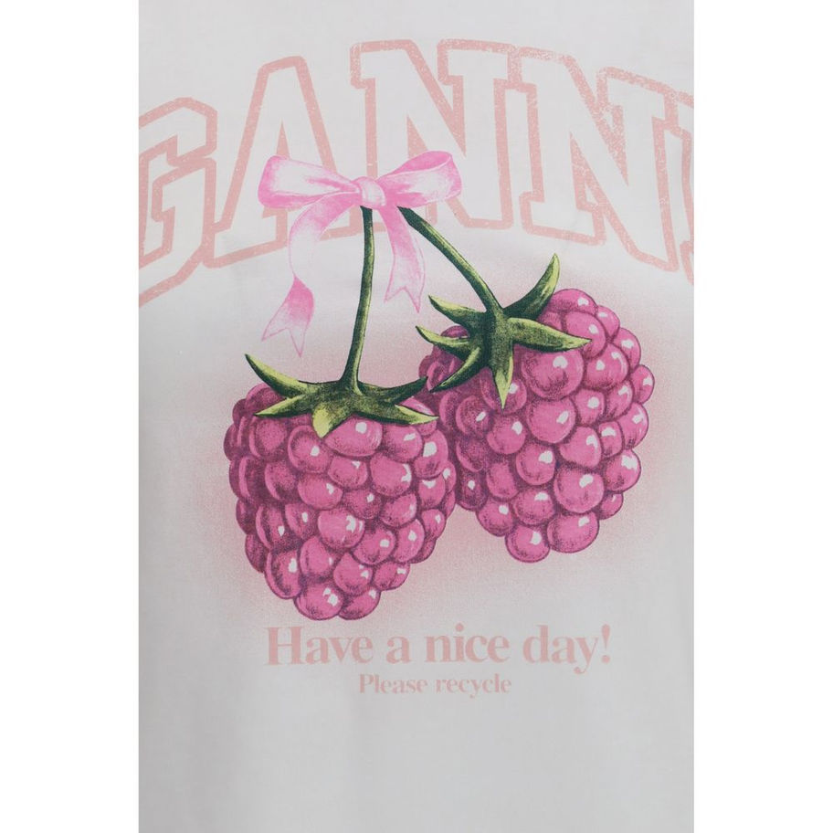 The raspberries cotton T-Shirt with round neckline and short sleeves by GANNI delivers a playful and contemporary casual style. The GANNI logo is paired with a raspberry print graphic, while the “Have a nice day! Please recycle” message adds an ironic and conscious touch. Crafted from soft cotton, this T-Shirt by GANNI ensures comfort and versatility for everyday wear.