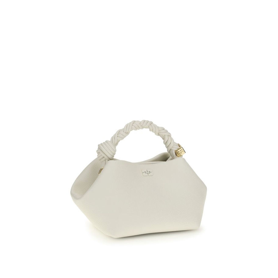 The small Bou Handbag by Ganni, with its grainy texture, combines elegance and functionality in a compact design. Featuring the tone-on-tone Ganni Butterfly logo and embossed logo on the back, it has a braided top handle with knot, adjustable and removable shoulder strap, and metal nuts engraved with the Ganni and Butterfly logos. The internal magnetic closure and two internal compartments complete the bag, offering practicality and style.