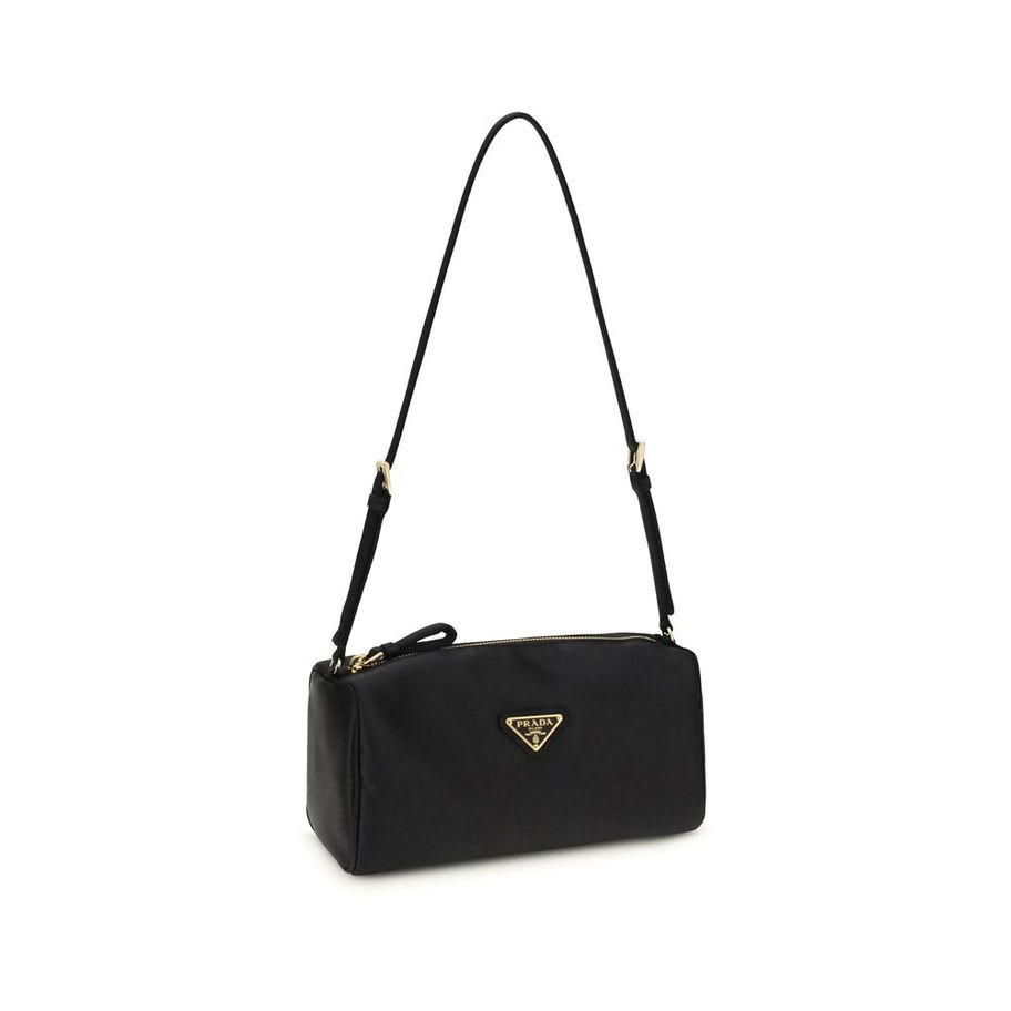 The satin Shoulder Bag by Prada is an elegant and sophisticated accessory, characterized by a silhouette with essential geometries. Featuring a top zip closure, it has an enameled metal triangle logo on the front, an adjustable shoulder strap with strap, and gold-tone metal hardware. The design is completed by a practical internal zip pocket, ideal for combining style and functionality in a single iconic piece.