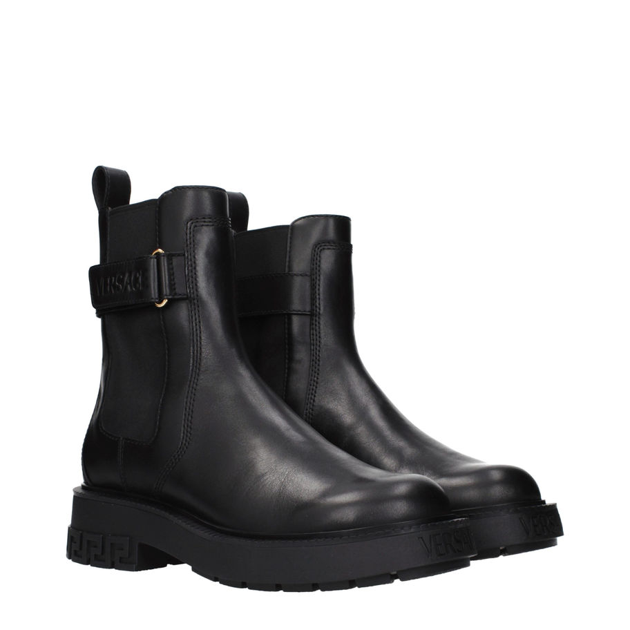 The product with MPN 10178721A127551B00V and code F86277 leather in black is a ankle boots designed by Versace. It has features like front logo, side logo, back detail.