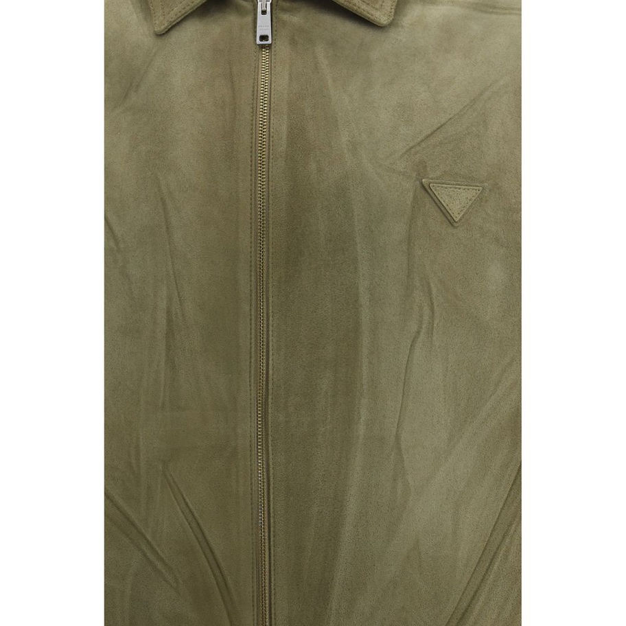 The suede Jacket by Prada is a sophisticated piece with a contemporary design, featuring a shirt collar and a central metal zip closure. The straight sleeves with shirt cuffs and inset pockets enhance the clean, minimalist silhouette, while the triangle logo on the front adds an iconic detail. The elasticated hem and inner lining complete the garment, ensuring comfort and a flawless fit.